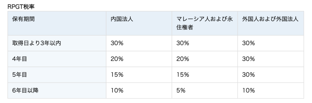 6年目以降になると外国人非居住者のRPGT率が10%であるのに対し、マレーシア人、永住権保有者に対してはRPGT率5%のみの課税のみで済むことになります。
