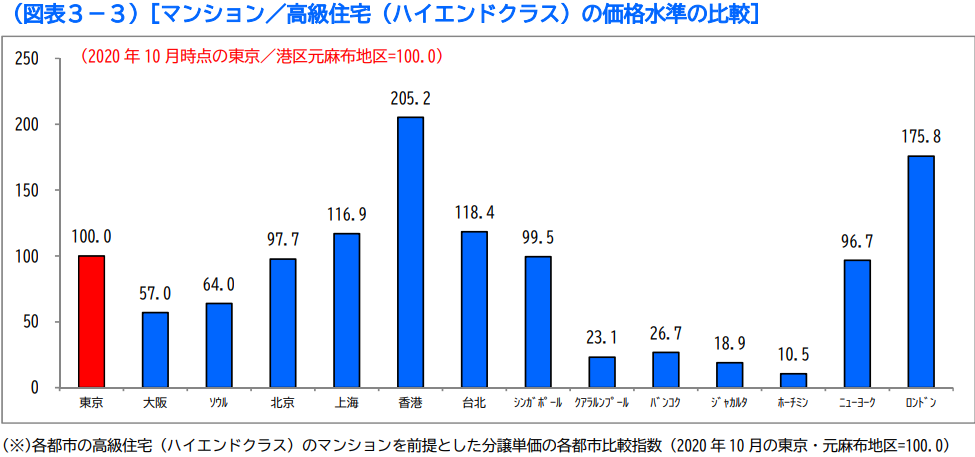 東京都の麻布の家賃を100とした場合、㎡あたりで比較した住宅価格は、マレーシアがインドネシアのジャカルタやタイのバンコクを抑えて、ベトナムのホーチミンの次に安い賃貸水準であると言うことができます。
