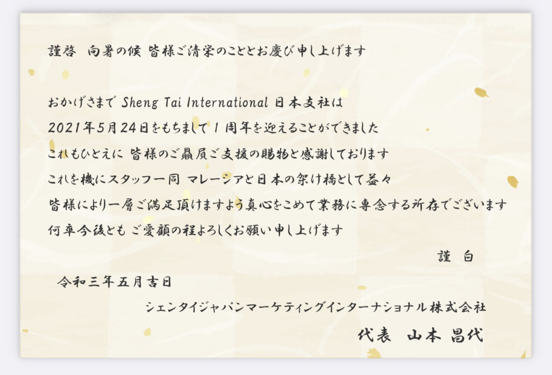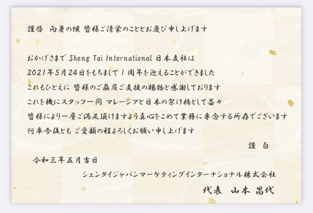 2020年5月にSheng Tai Internationalの日本支社であるシェンタイ ジャパン マーケティング インターナショナル株式会社を設立し、銀座にオフィスをオープンしてから1年を迎えました。